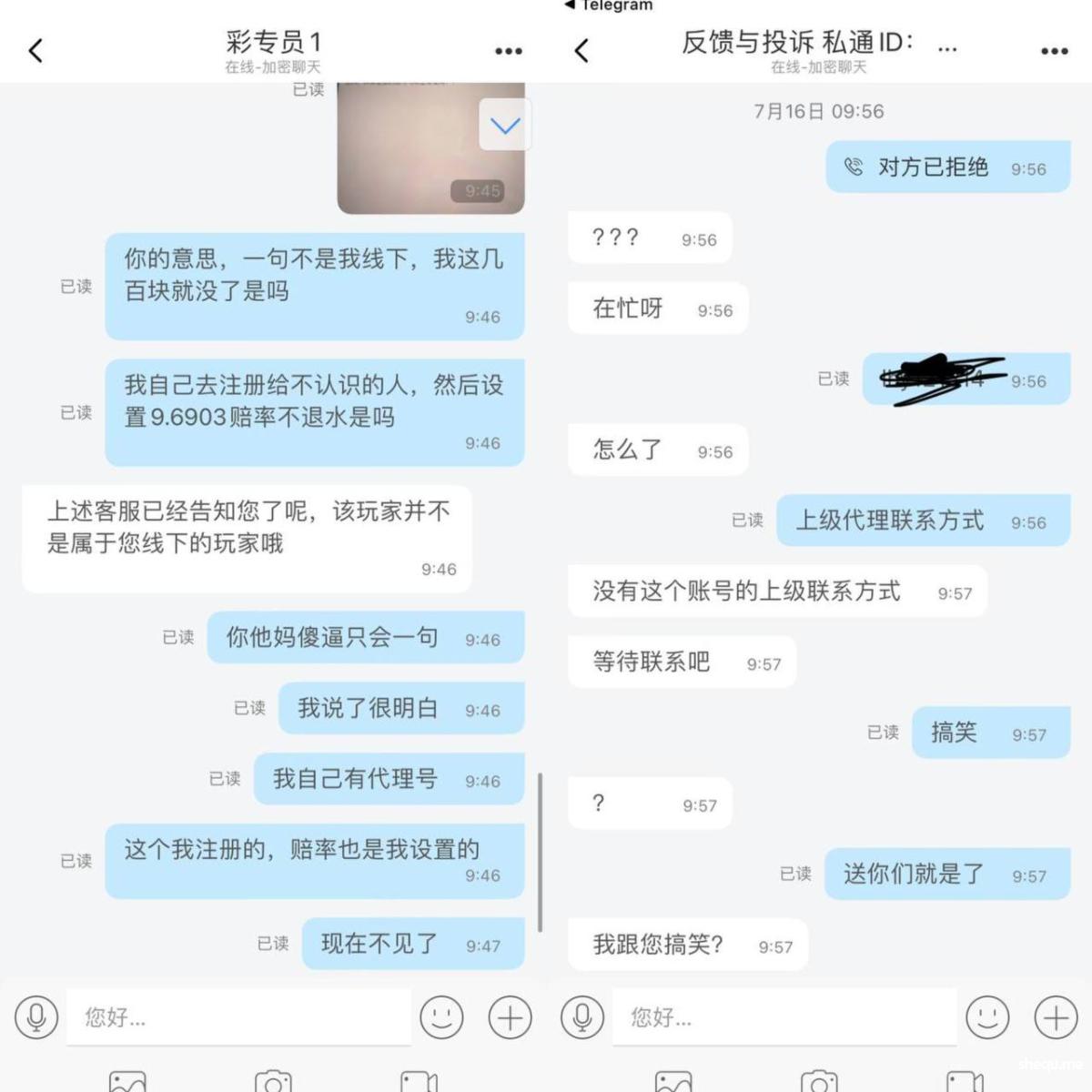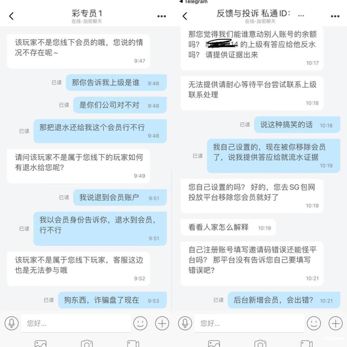 我后台添加会员,设置退水、密码、密保、提款密码、绑定银行卡等操作,结果平台发现后就推说是我自己注册错了。会员记录明明显示新增会员,他们却狡辩说我注册错了。我要求提供上级联系方式,他们说没有。明明是他们自己的代理线,知道我要曝光后,就假装好心说要帮我查。使用聊天软件还搞自动清除聊天记录的把戏。