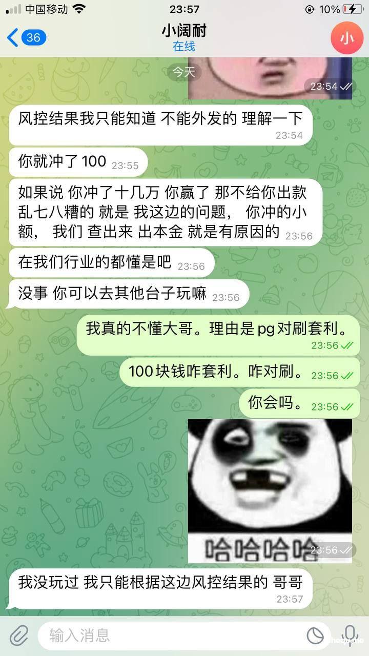充值了100打到600不给提现。理由是pg对刷套利。我一共就领了你们28彩金。我还要套利。玩了这么多台子第一次听说pg还可以对刷。什么牛马台子