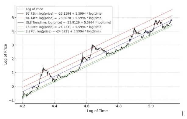 从幂律来看,现在的价格区间正处于回归线上。这是一个纠结的位置,既不是大幅低于回归线的抄底时机,也不是大幅高于回归线的抛售时机。