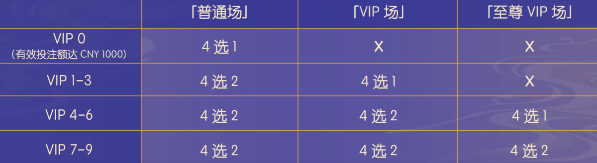 b)「VIP 场」:  i. VIP 1-3 的玩家 4 选 1  ii. VIP 4-9 的玩家 4 选 2
