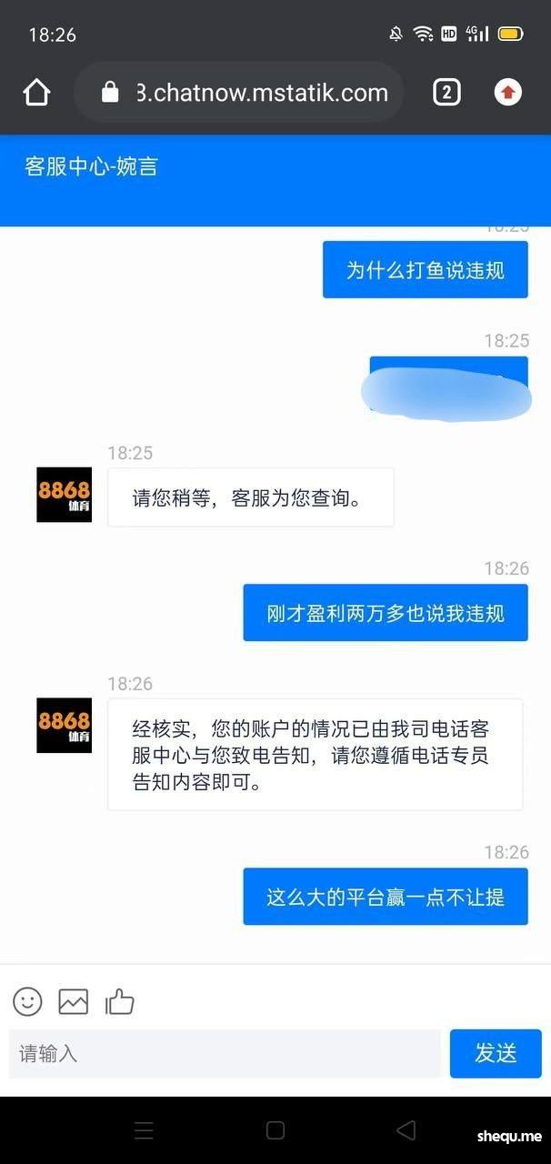 我本来不想发的,但是还是看见这个8868在害人,我是22年被8868体育黑了18w想不到现在这台子还在开,还在祸害别人。他这个台子是只能输的台子,你赢了,他不会在客服端跟你说都是打电话来说,系统出错误。前面玩了一个月送了断断续续10万多,就是一次红了18个被黑了,打电话来说是系统出错,退本金还需要打够流水才可以提,我也认了,当时毕竟钱在他那边,后面就是退给我本金到账号,继续打流水。进去又赢了2w5,因为本人打的是电子ag扑鱼,号上三万多,我想提款,又是一样套路,还是说系统出错。还是扣了我赢的,还是退本金,但是不给我进去ag里面任何游戏了。玩这么久第一次被黑。本来想报警的,后面想想算了。我当时有截图我放到微信收藏起来了,发出来的意义是避免更多人受害,这个平台存在很久了,还在玩的,别想你还能提,我之前也是提,你只要一赢,他就会黑。因为到现在我还在玩,多的少的也都可以提,只是这个平台不行。希望大家早点远离吧。
