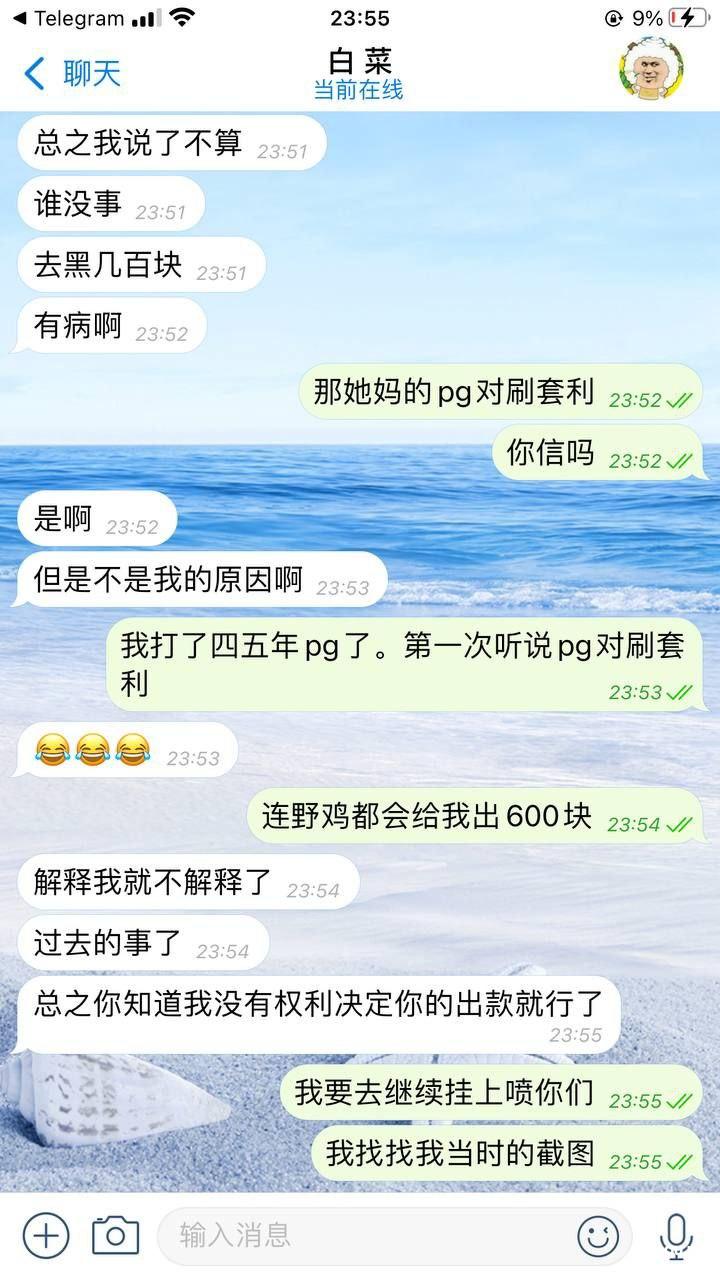 充值了100打到600不给提现。理由是pg对刷套利。我一共就领了你们28彩金。我还要套利。玩了这么多台子第一次听说pg还可以对刷。什么牛马台子