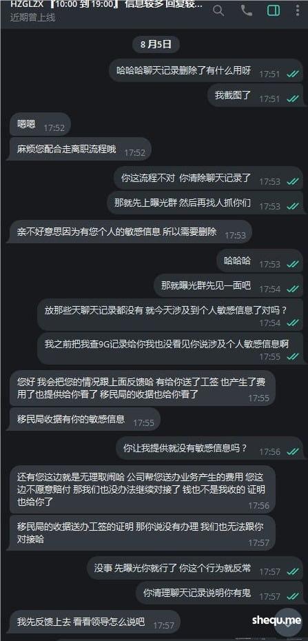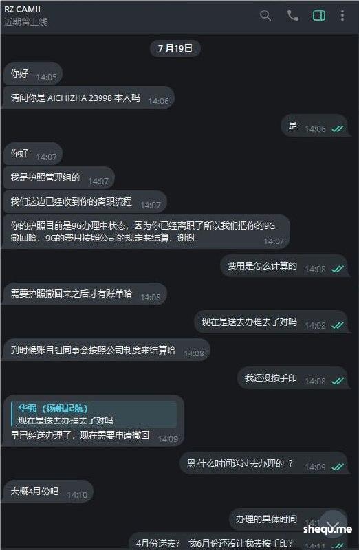 7月19日公司RZ部门 RZCAMII同事联系我说收到了离职申请,目前我的护照办理9G中离职了要把我的9G撤回 我问什么时间送过去办理回复我4月份, 说7月初同事通知我去按指纹 而我接到消息都7月11日了
