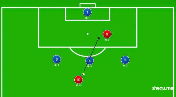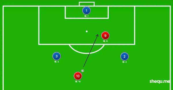 如果在这条传球路线上加一个中后卫,红10就得起高球找红9了,后者还是可以拿到大把射门机会。