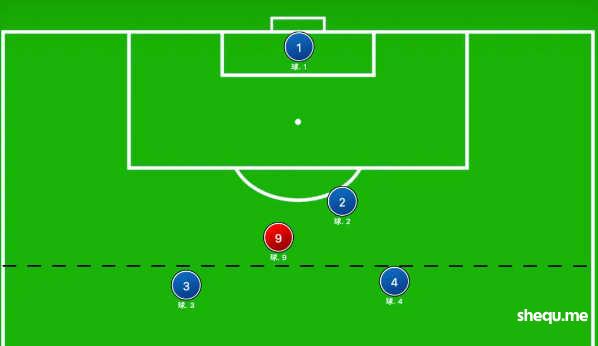 对红9采取盯人防守不会取得什么成效,因为他总是可以在后卫身后接到球。事实上,无论设置几个后卫,只要没有越位规则,10号传给9号这一条球路都始终存在。